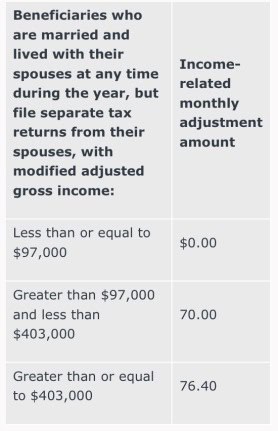Premiums for high-income beneficiaries with full Part B coverage who are married and lived with their spouse at any time during the taxable year, but file a separate return, are as follows: