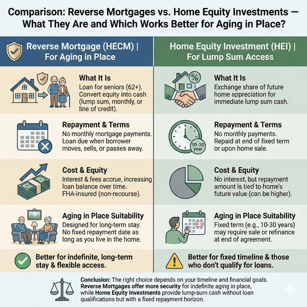For seniors whose goal is to fund in-home care over an uncertain and potentially lengthy period, HECM reverse mortgages remain the most durable, flexible, and regulator-tested option available. HEIs may work in narrow, carefully defined situations, but they are not functional substitutes for reverse mortgages when aging in place is the objective.