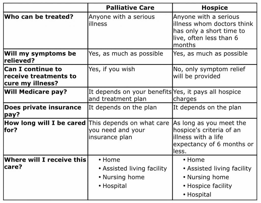 Please see the chart below for some differences between Palliative Care and Hospice Care: