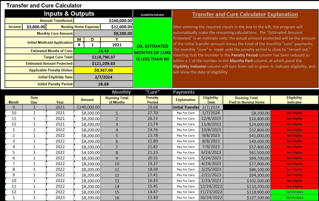 The Transfer and Cure Calculator calculates the initial penalty period and shows how the penalty period is reduced each month as the money is returned, either by the transferee using the gifted money to pay the nursing home each month or by the transferee returning money to the nursing home resident each month (who in turn pays it to the nursing home in the same month).