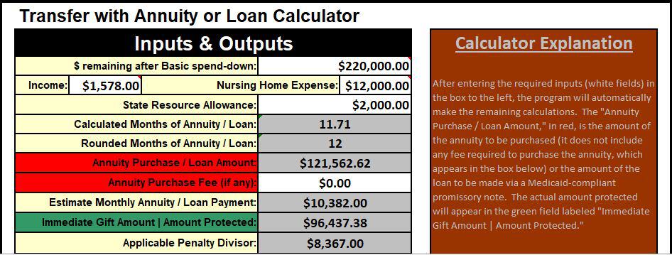 The Transfer and Annuitize Calculator calculates the penalty period and calculates the Gift Amount (i.e., the amount protected) and the Annuity Amount (to pay for care during the penalty period).
