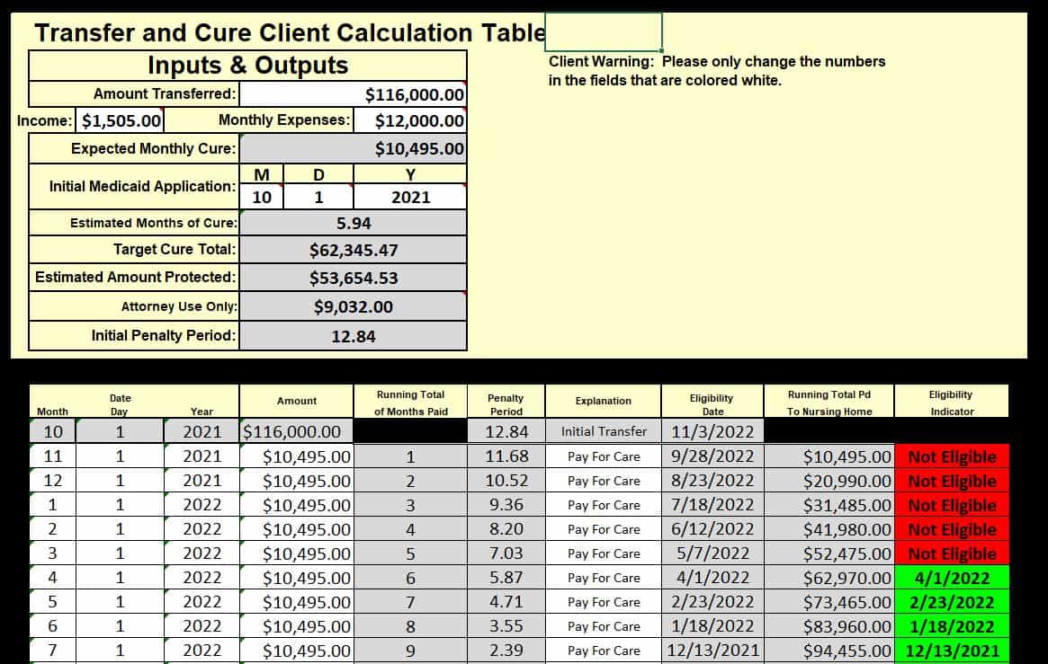 The main problem with all Transfer and Cure strategies (also called Reverse Half-Loaf strategies) is that clients, as well as many attorneys, have a difficult time understanding how the strategy works. I spent over a hundred hours developing this program, which clearly shows (in a way you and your clients can both understand), the gradually declining penalty period as the transferee makes the partial cure each month. Additionally, I include my Client Calculator Module that allows clients to keep track of the gradually reducing penalty period as they make the partial cure each month.